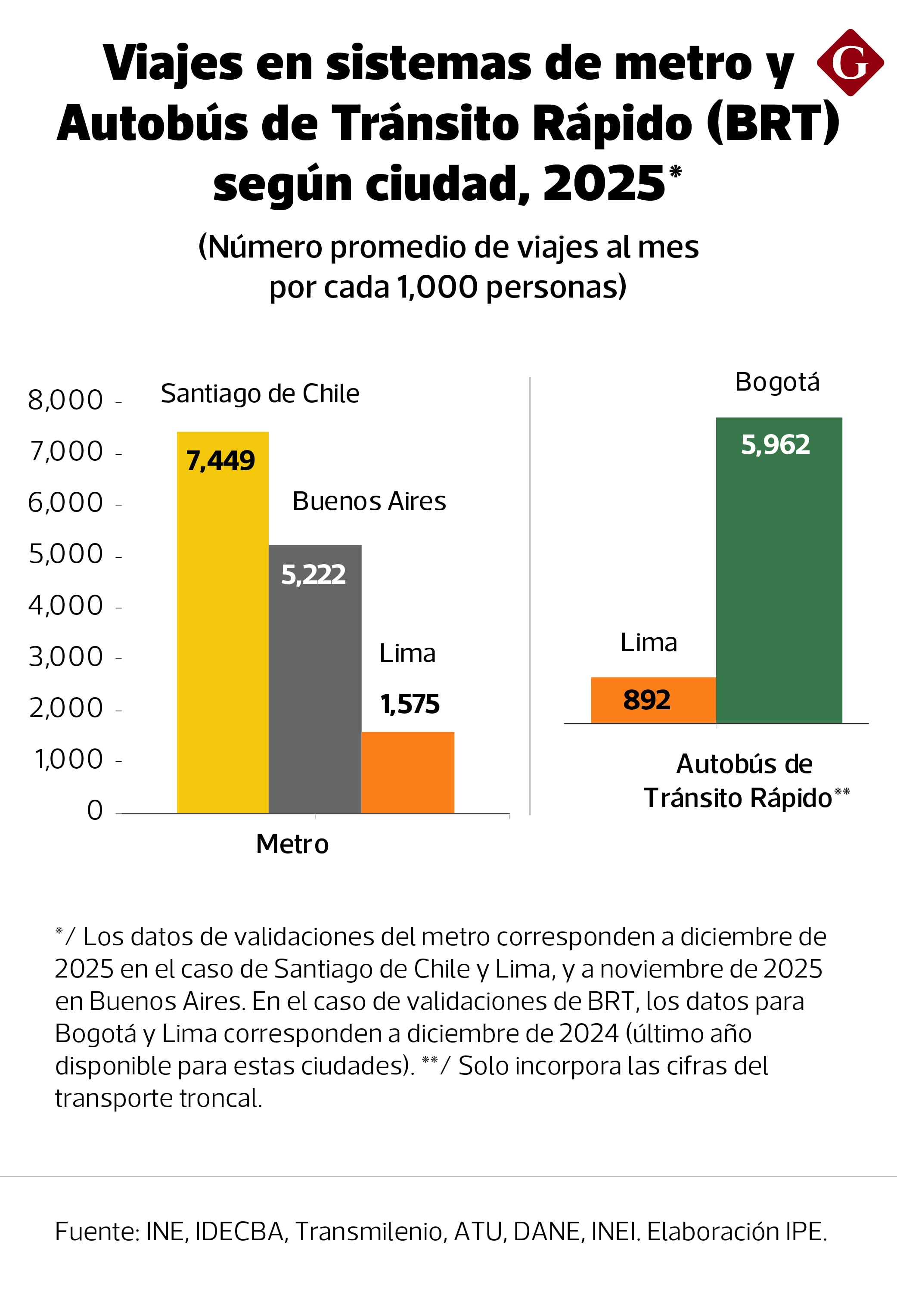 Sin embargo, la cobertura de estos sistemas aún es limitada. En Lima, la Línea 1 apenas registra 1,575 pasajeros por cada mil habitantes, cinco veces menos que el Metro de Santiago. Asimismo, el Metropolitano alcanza en promedio 892 viajes por cada mil personas, mientras que el TransMilenio en Bogotá reporta casi siete veces más.