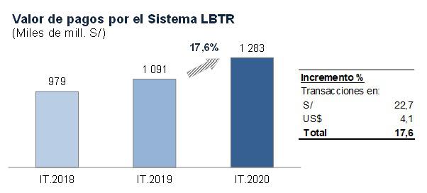 Por tipo de moneda, en el sistema LBTR se procesaron operaciones en soles por un monto de S/ 914 mil millones en el primer trimestre del año, 22.7% más que el realizado en el mismo periodo de 2019.