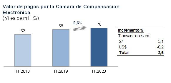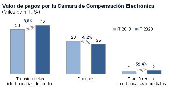 El crecimiento de las operaciones en la CCE se dio principalmente en las transferencias de crédito (pagos de planilla, proveedores y CTS, entre otros) que aumentó 8.8%; y en los realizados con transferencias inmediatas, que se expandió 52.4%. El valor de las operaciones con cheques se redujo en 9.2%.