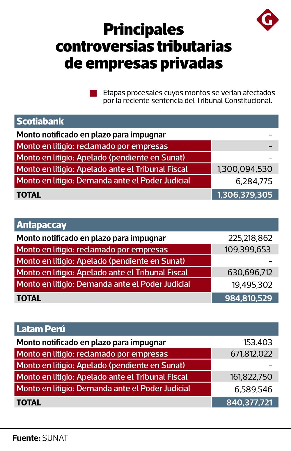 Del total en disputa, más de la mitad (S/11,800 millones) está en el Tribunal Fiscal (TF), un órgano resolutivo -independiente de la Sunat- que funge como segunda instancia administrativa para los reclamos. Allí, por ejemplo, Las Bambas y Backus tienen más de S/2,000 millones en disputa cada una; Scotiabank, S/1,300 millones; y Chinalco, S/710 millones.