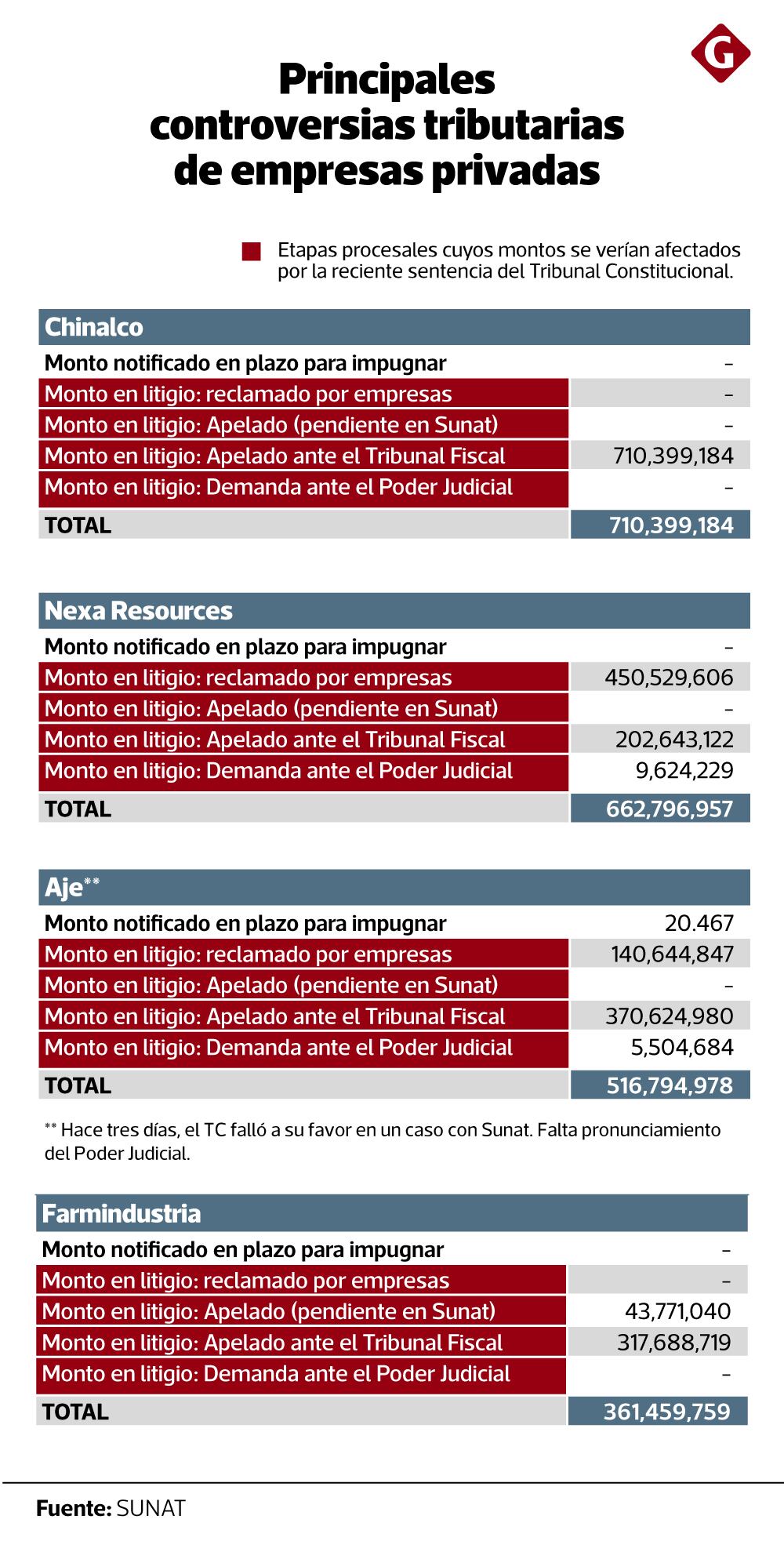 Las otras dos etapas de litigio con montos que podrían reducirse por el fallo del TC están en la propia Sunat (reclamado y apelado), que tiene nueve meses para resolver, y suman S/3,886 millones.