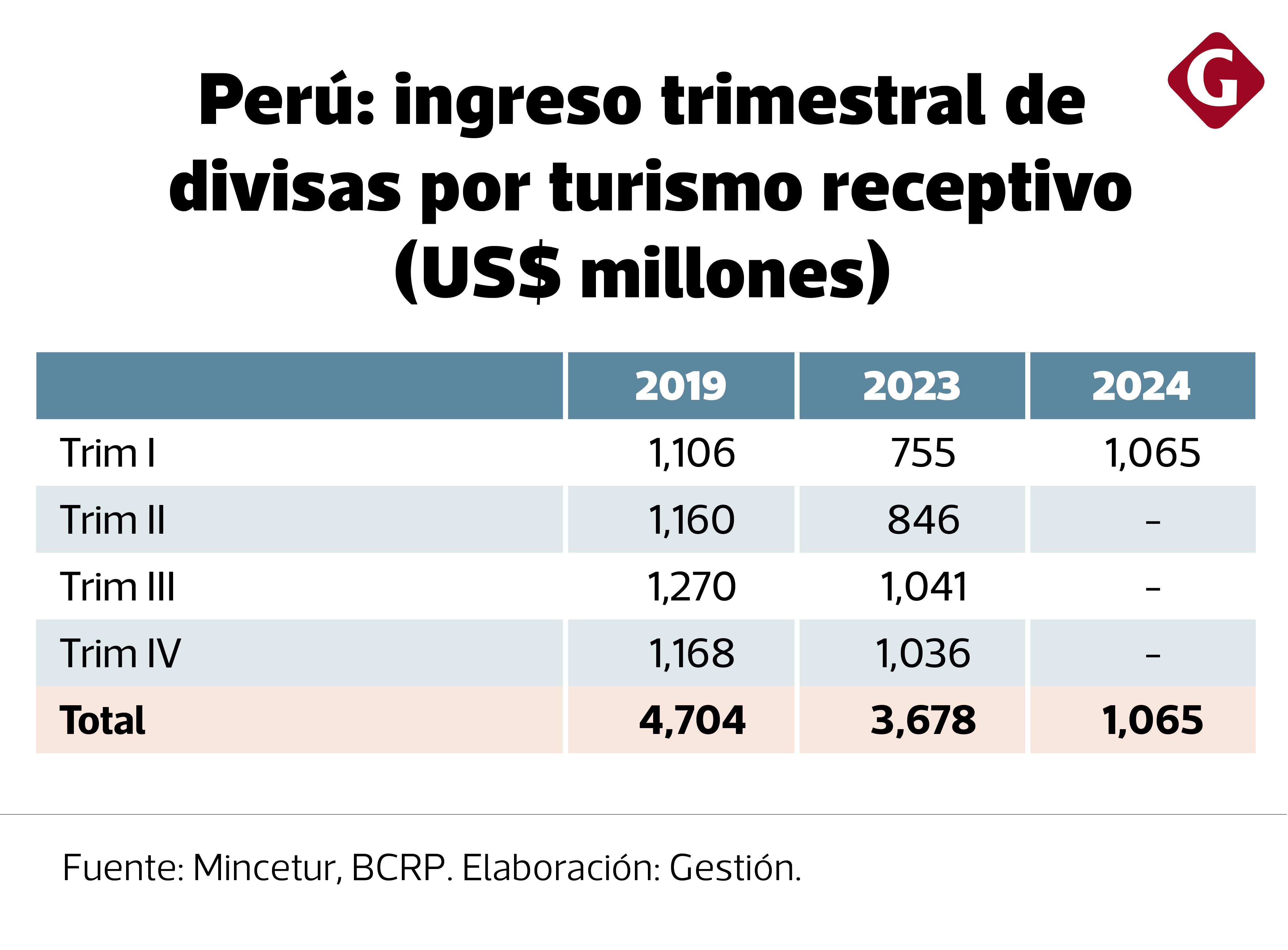 Según datos cruzados del Ministerio de Comercio Exterior y Turismo (Mincetur) y del Banco Central de Reserva del Perú (BCRP), se registraron US$ 1,065 millones en divisas por turismo receptivo entre enero y marzo del 2024. Esa cifra es superior en 41% al primer trimestre del 2023, cuando ingresaron US$ 755 millones.