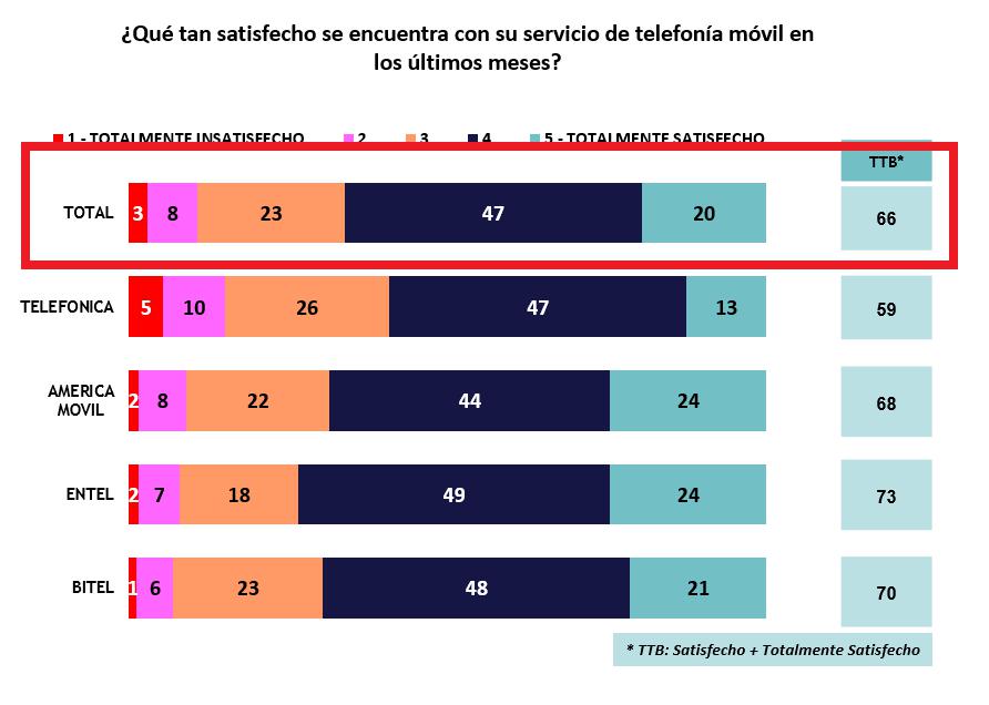 A nivel de operadoras telefónicas, las empresas Entel y Bitel resultaron aprobadas con su servicio, pues un 70% y 73%, respectivamente, declaró estar satisfecho con el servicio de telefonía móvil recibido.