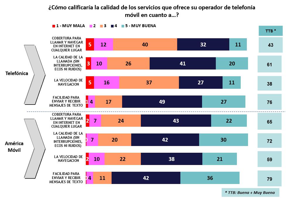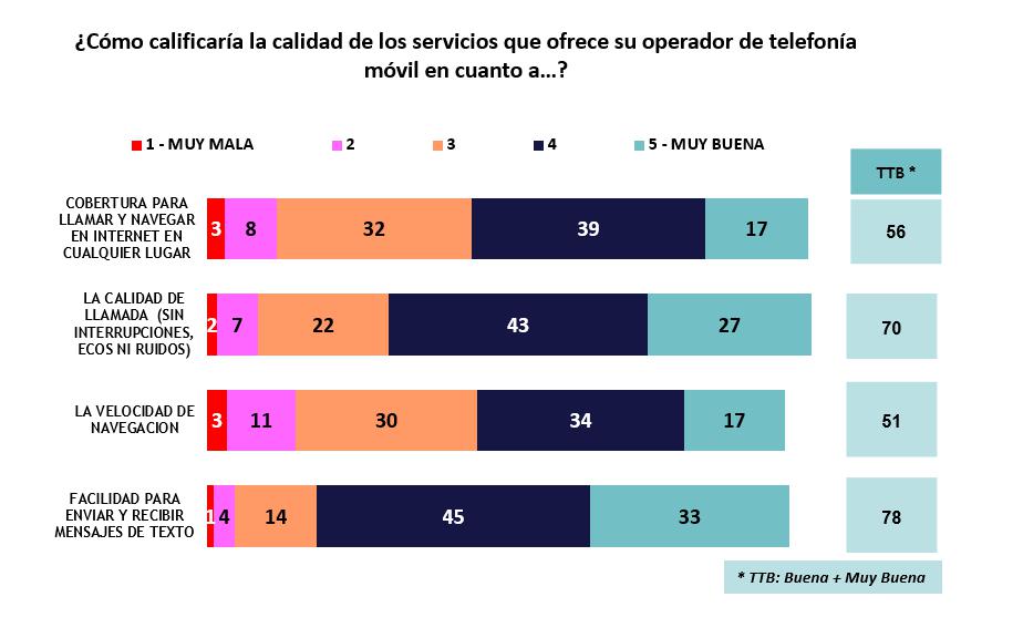 Los usuarios también manifestaron su disconformidad con la calidad de la cobertura para llamar y navegar en internet desde cualquier lugar, pues este servicio solo logró una aprobación de 56%, considerado un nivel bajo. Además, la velocidad de navegación en internet obtuvo un 51% de satisfacción, también considerado un nivel deficiente.