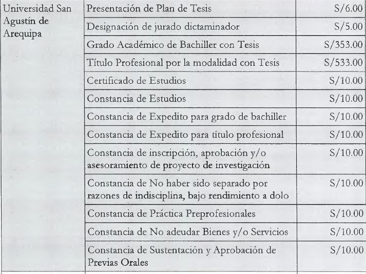 Así por ejemplo -detalla el proyecto- en la Universidad San Agustín de Arequipa existen pagos por presentación de Plan de Tesis (S/ 6), designación de jurado dictaminador (S/ 5) así como constancia de inscripción, aprobación y/ o asesoramiento de proyecto de investigación (S/10). Solo el grado académico de Bachiller con tesis tiene un costo de S/ 353 y el Título Profesional por la modalidad con Tesis tiene un costo de S/ 533.
