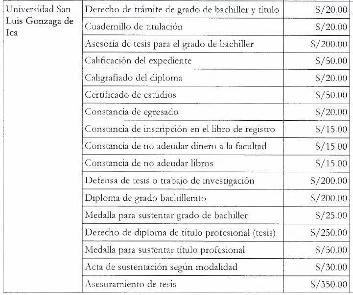Similares costos se puede observar en la Universidad San Luis Gonzaga de Ica, donde los estudiantes deben realizar pagos por derechos de trámite de grado de bachiller y título (S/ 20), asesoría de tesis para el grado de bachiller (S/200), medalla para sustentar grado de bachiller (S/25), defensa de tesis (S/ 300), entre otros. En este caso el diploma de grado bachillerato tiene un costo de S/ 200 y el derecho de diploma de título profesional en modalidad de tesis tiene un precio de S/ 250.