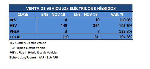 La Asociación Automotriz del Perú (AAP) informó que se vendieron 311 vehículos eléctricos e híbridos entre enero y noviembre, número mayor en 161 unidades (107%) con relación a similar periodo del 2018, y también muy por encima (93%) de la cantidad de unidades vendidas en todo el 2018 (161 unidades).
