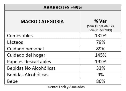 Patricia Pellón, de Lock y Asociados, detalla que dicho incremento se da por la alta demanda de abarrotes que se dio en esa semana, 99% por encima de la misma semana del año anterior, siendo la sección que mayor impulso aporto al crecimiento, seguido de perecibles cuyas ventas subieron en 35%, mientras que la categoría “Non Food”, que considera electro, útiles, hogar, decoración, textiles, se contrajo en 16%.