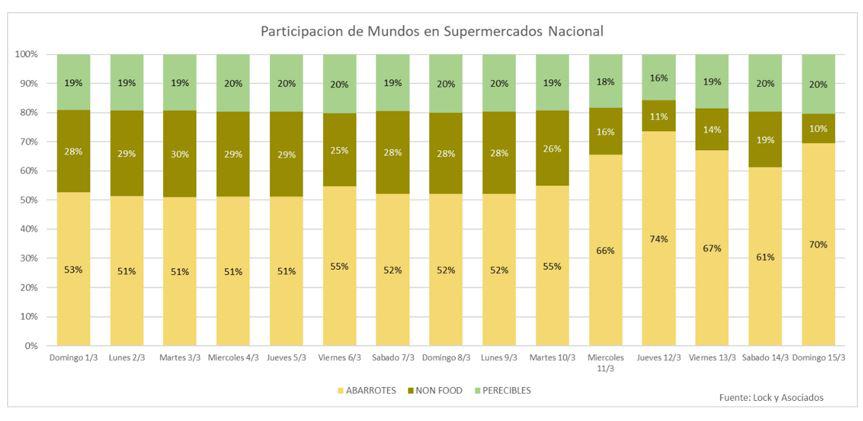“Esta venta que se da principalmente en abarrotes, hace que la estructura de ventas de las tres grandes secciones del canal se modifique, aumentando la relevancia de abarrotes de 53% en promedio a un 70%, viéndose, obviamente reducido el peso de la sección Non Food”, sostiene la consultora.