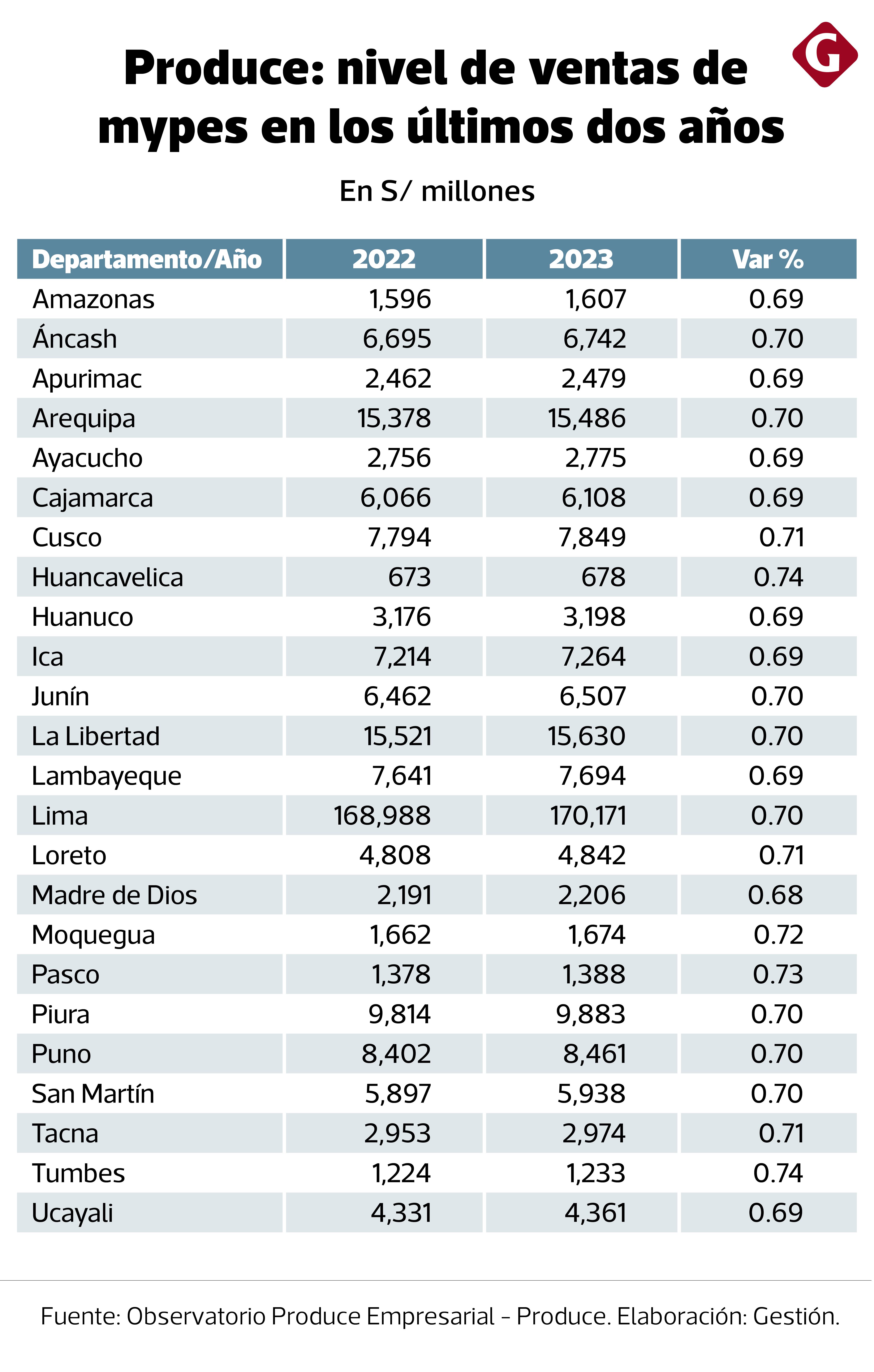 La región Huancavelica merece una mención especial, pero por señales negativas. Se trata de la única región que no alcanza, ni de cerca, los S/ 1,000 millones en ventas. Tanto en 2022 como 2023, de acuerdo con Produce, las mypes de este departamento no alcanzaron ni S/ 680 millones.