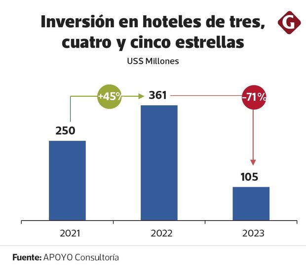 Del otro lado, tanto el mercado de oficinas como el de construcción de hoteles registró caídas el año pasado. La inversión en hoteles de tres, cuatro y cinco estrellas cayó en 71% (a US$ 105 millones), luego de dos años de recuperación pospandemia. En el caso de las oficinas, si se analiza Lima, la inversión se redujo en 70% (a US$ 20 millones), aún sin lograr una recuperación de la pandemia.