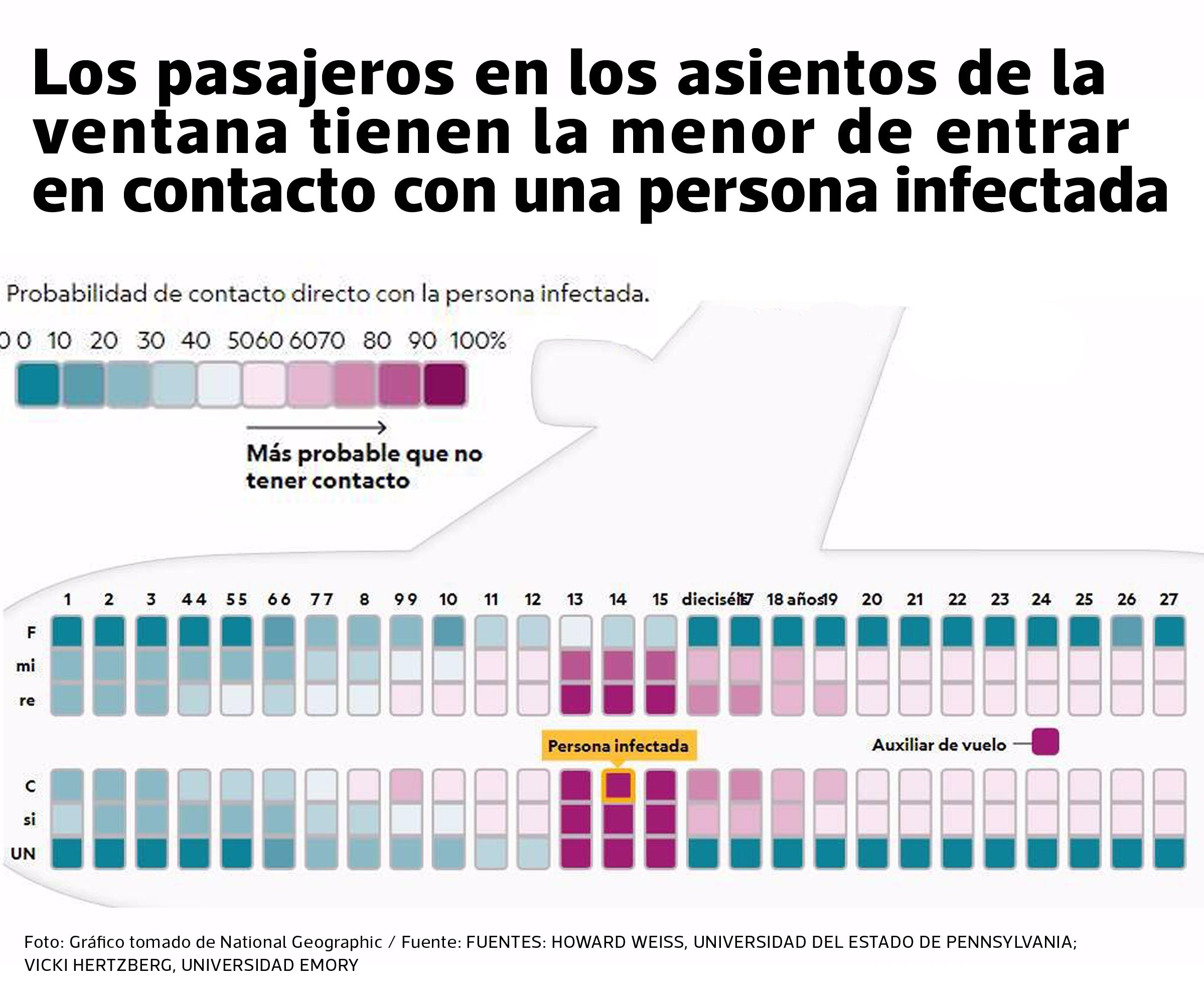 No obstante, el modelo del equipo muestra que los pasajeros en los asientos intermedios y del pasillo, incluso aquellos que están dentro del rango de dos asientos de la OMS, tienen una probabilidad bastante baja de infectarse.