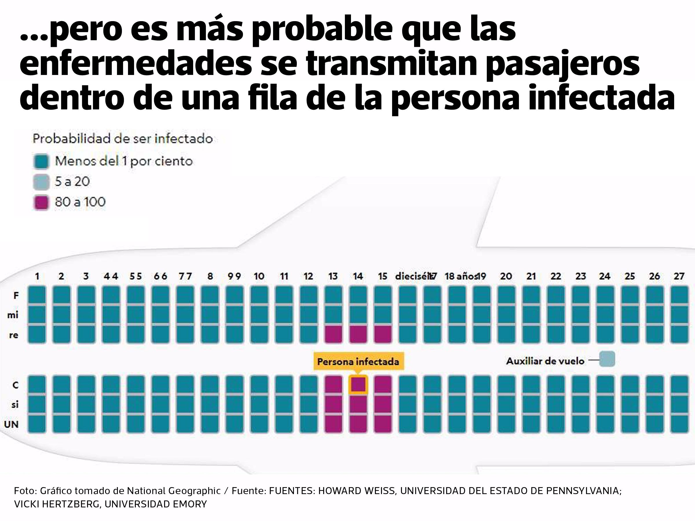 "Si está sentado en un asiento de pasillo, ciertamente habrá bastantes personas pasando por delante de usted, pero se moverán rápidamente", dice Weiss. "En conjunto, lo que mostramos es que hay una probabilidad bastante baja de transmisión a cualquier pasajero en particular".