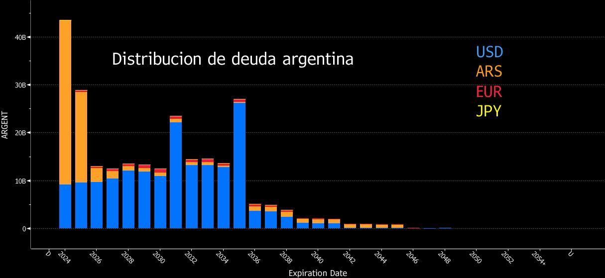 Las reservas internacionales del banco central eran de US$ 28,000 millones la semana pasada, una cantidad que no es suficiente para convertir tanto el dinero en circulación como la deuda en pesos. El gráfico a continuación muestra los bonos adeudados por el Gobierno argentino y sus entidades garantizadas. No incluye la deuda con el FMI.