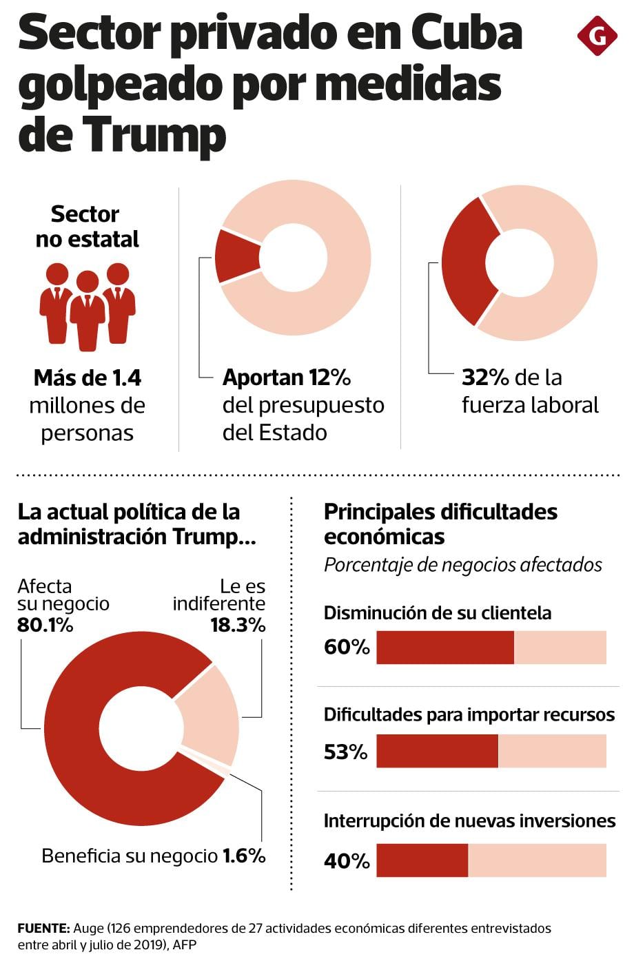 De una muestra de 126 emprendedores entrevistados por la consultora cubana Auge, más de las tres cuartas partes (80.1%) afirma que sufre la política estadounidense, que se ha endurecido.