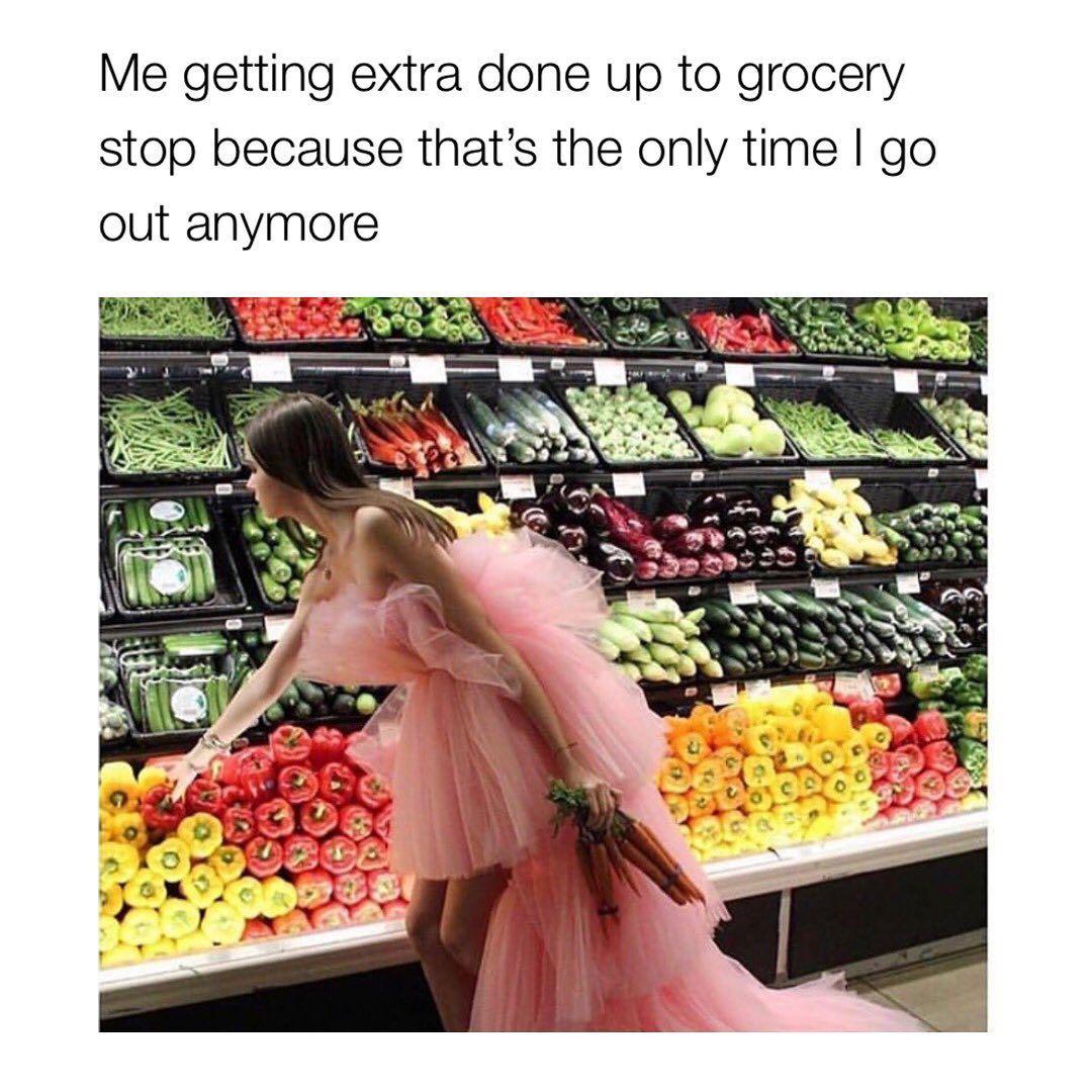 Muestra a una mujer con un vestido de gala rosa, con una cola de tul ondeando tras ella. No está en una fiesta ni caminando por una elegante alfombra roja; está en una sección de productos de supermercado, agarrando un montón de zanahorias en una mano y buscando un pimiento rojo con la otra.