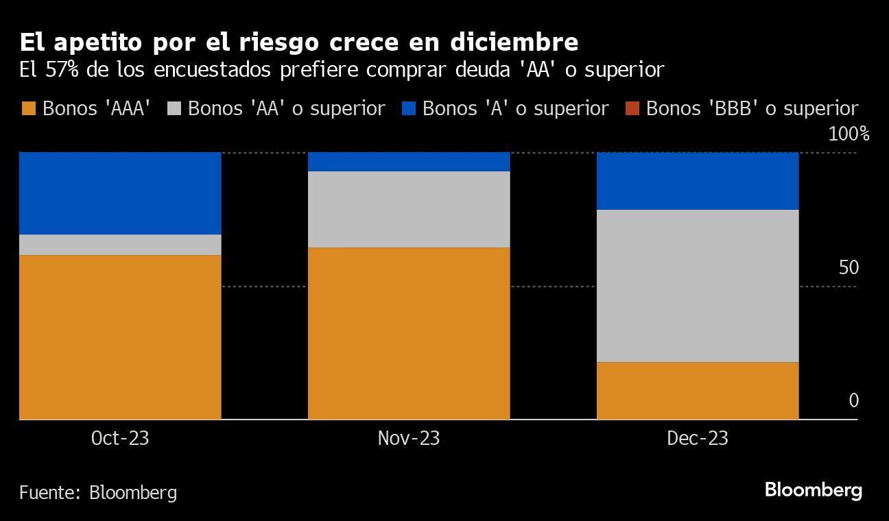 El porcentaje de analistas y operadores que recomiendan deuda con una calificación de al menos “AA” casi se duplicó en diciembre al 57%, su mayor nivel desde febrero de 2022. Aquellos que no quieren nada con calificación inferior a “AAA” cayeron del 64% al 21%.