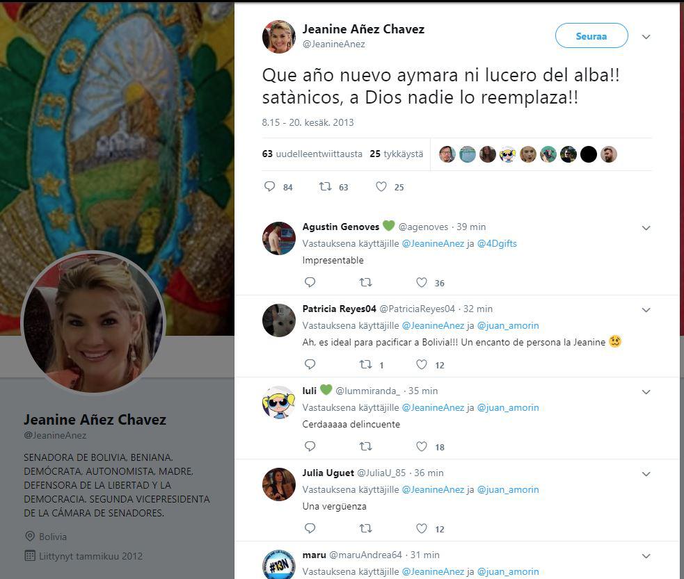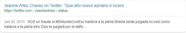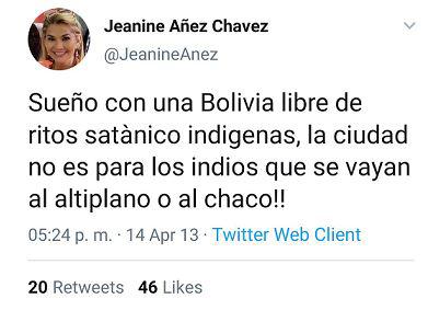 Una de las capturas que más ha sido compartida es la de un supuesto tuit (4) del 14 de abril de 2013 en el que Áñez habría manifestado: "Sueño con una Bolivia libre de ritos satánico indígenas, la ciudad no es para los indios que se vayan al altiplano o al Chaco". Pero no hay registro de esta publicación.