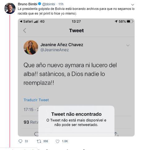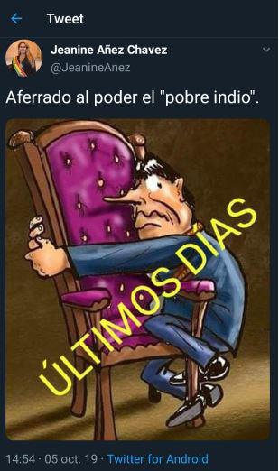 También circulan capturas de un tuit del 5 de octubre de 2019 en el que Áñez califica al entonces presidente de Bolivia Evo Morales de "pobre indio" "aferrado al poder", junto a una ilustración del mandatario abrazado a una silla.