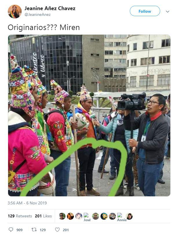 Otras publicaciones difunden la captura de pantalla de un tuit (8) en el que Áñez se pregunta si las personas que aparecen en una foto con zapatos son "originarios".