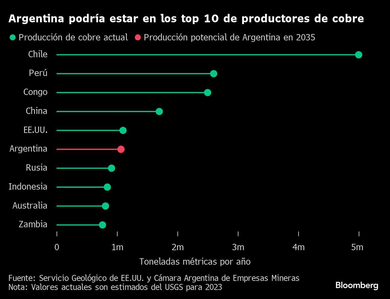 Pero si solo seis de las aproximadamente dos docenas de proyectos de cobre que se contemplan en Argentina se llevaran a cabo, el país podría convertirse en uno de los principales proveedores en 2035, produciendo más de un millón de toneladas métricas al año. Las exportaciones anuales podrían superar los US$ 8,000 millones, según el grupo minero local Caem.