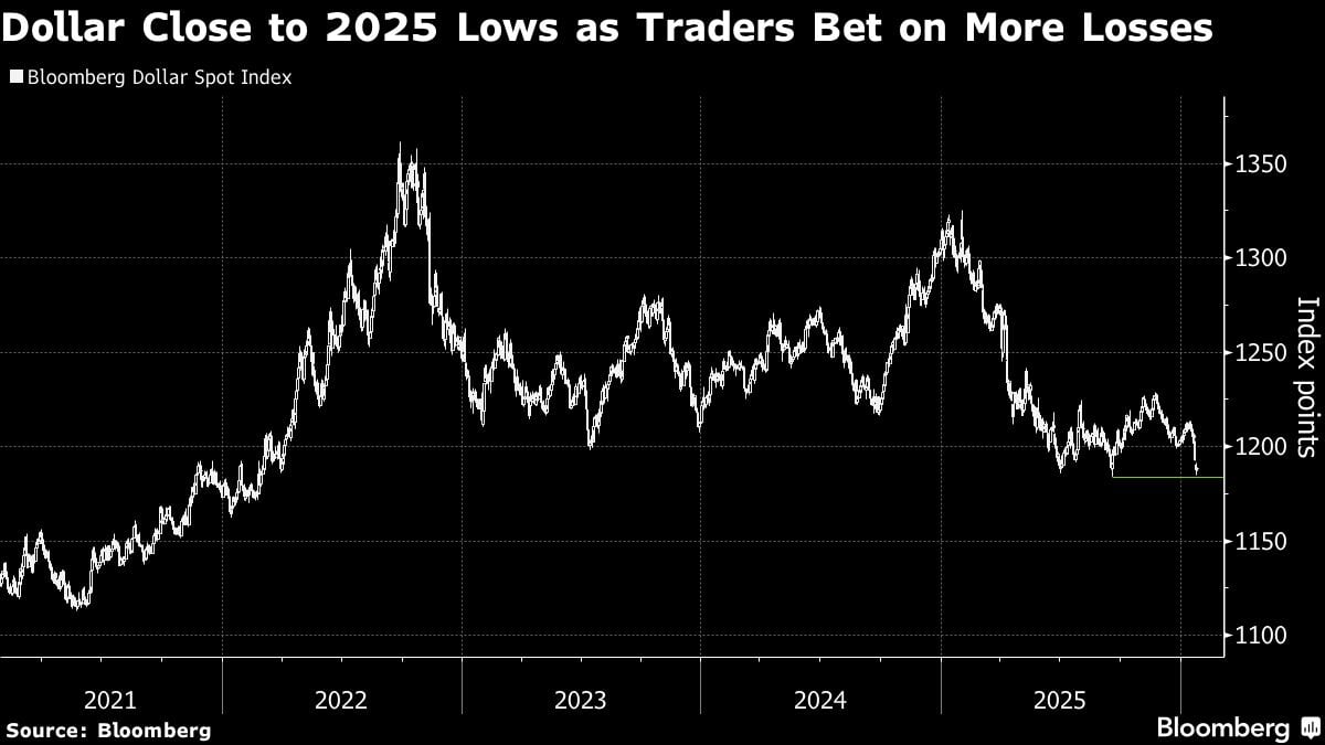 Si bien el índice Bloomberg Dollar Spot avanzó levemente el martes, su caída en los tres días previos fue la más pronunciada desde la turbulencia arancelaria de Estados Unidos en abril del año pasado. Si las pérdidas se reanudan, como sugieren los precios de las opciones, la moneda podría tocar su nivel más débil en cuatro años.
