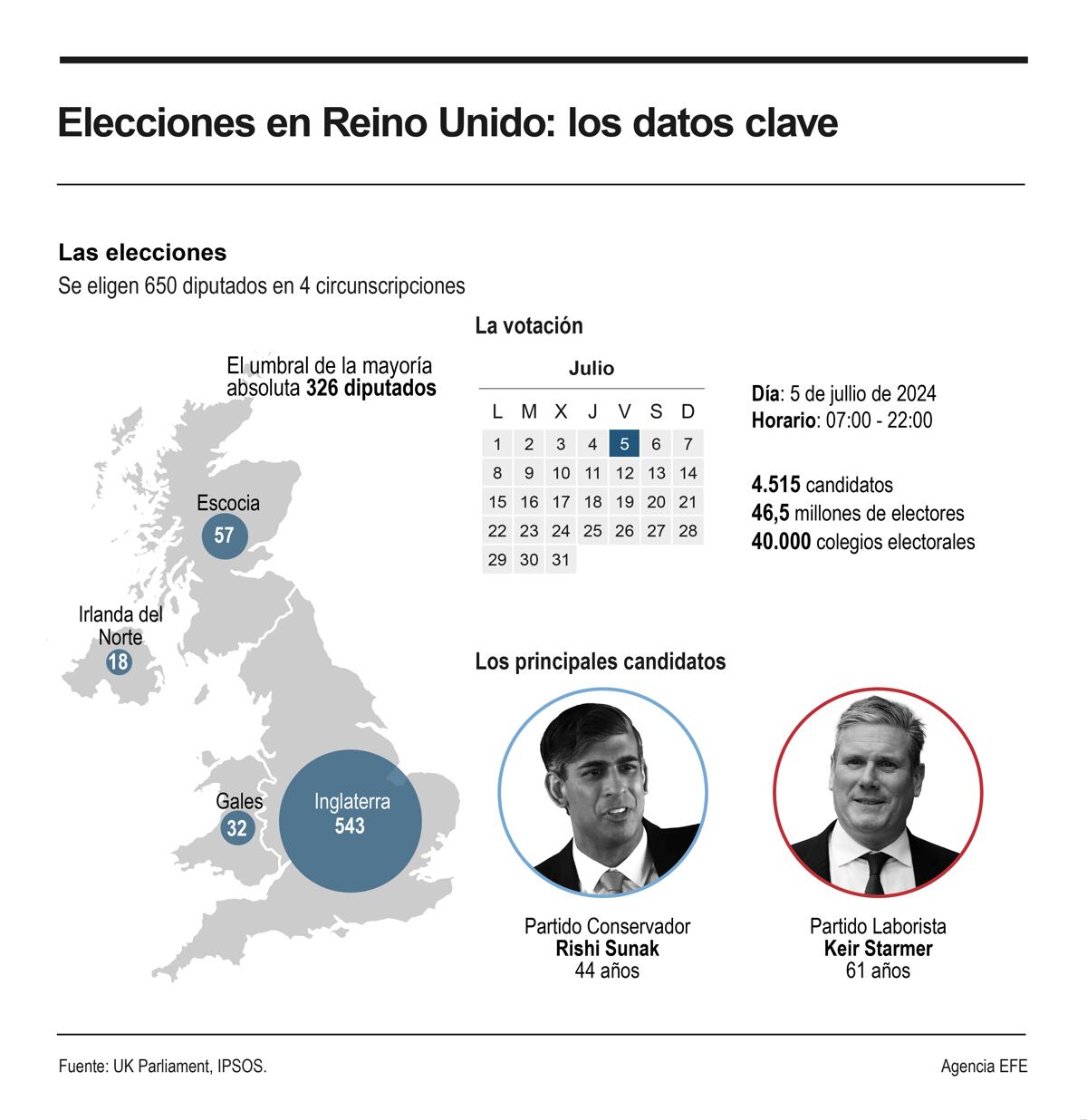 El Reino Unido se prepara para celebrar este jueves unas elecciones generales que, según las encuestas, devolverán el poder a los laboristas después de 14 años de gobiernos conservadores, si bien el primer ministro, Rishi Sunak, se esfuerza por minimizar una derrota que se anticipa demoledora.