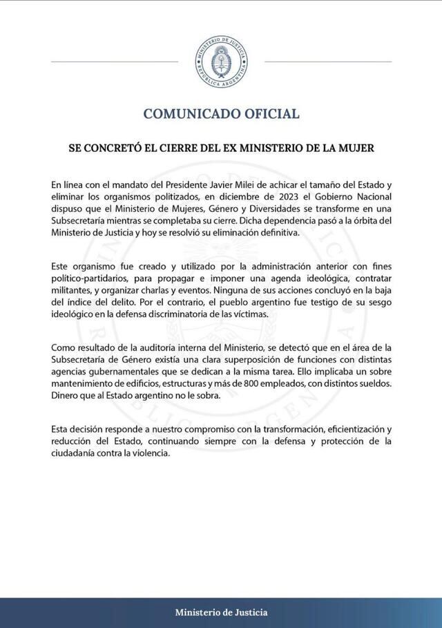 “En línea con el mandato del presidente Javier Milei de achicar el tamaño del Estado y de eliminar los organismos politizados, en diciembre de 2023 —fecha en la que asumieron las nuevas autoridades—, el Gobierno Nacional dispuso que el Ministerio de Mujeres, Género y Diversidades se transformara en una Subsecretaría mientras se completaba su cierre”, explica el comunicado.