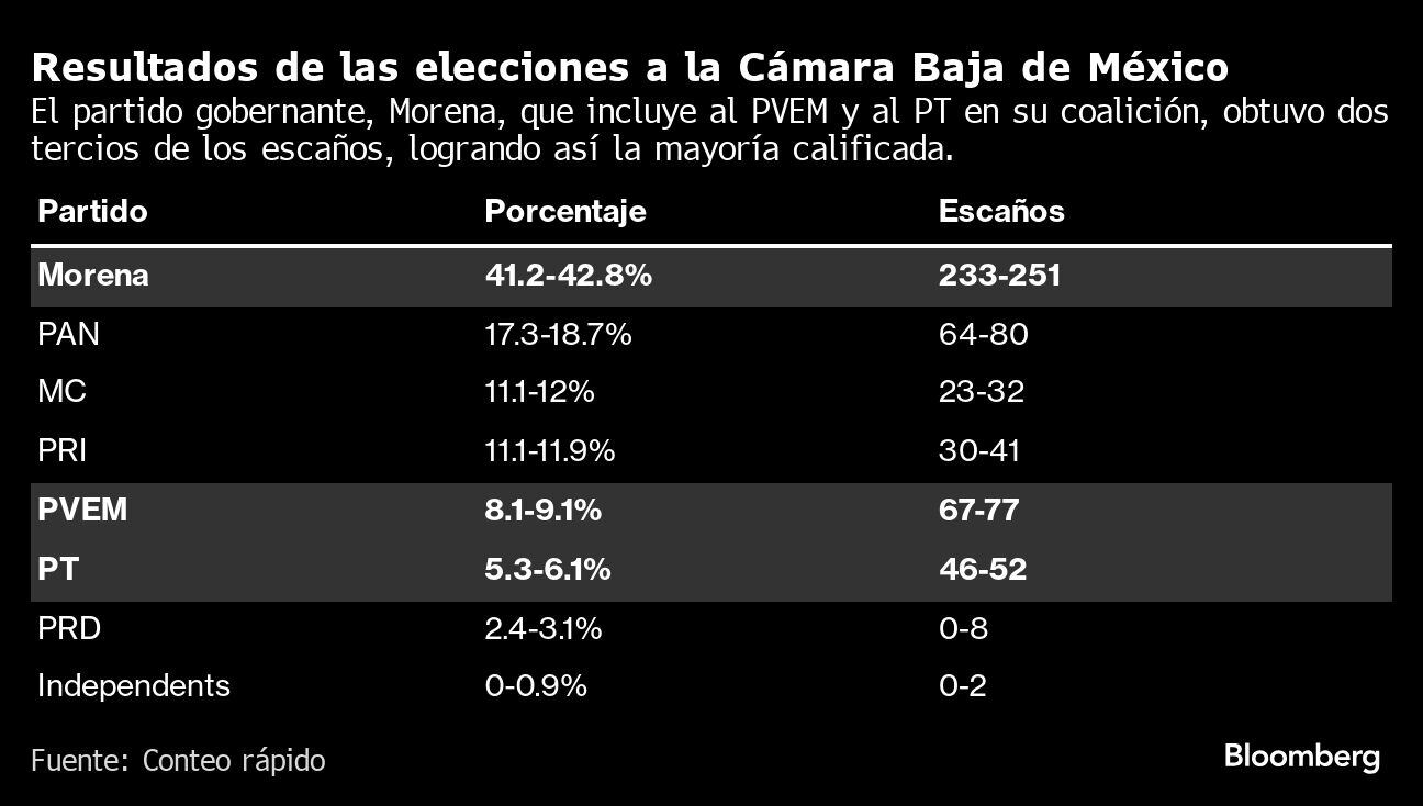 Se espera que el partido gobernante, Morena, y sus aliados obtengan entre 346 y 380 escaños en la Cámara Baja, compuesta por 500 legisladores, frente a los 330 escaños que tenían antes de la votación. Esta cifra supera el número de escaños necesarios para la supermayoría. En el Senado, la coalición gubernamental contará con 82 de los 128 escaños, a solo cuatro de la mayoría de dos tercios.