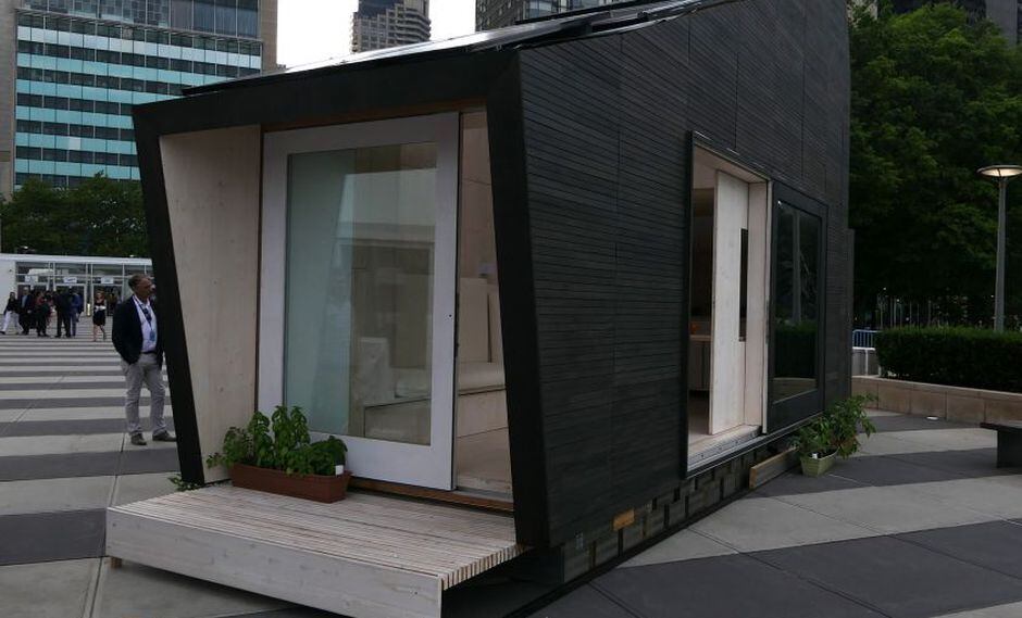 El pequeño prototipo de 22 metros cuadrados (237 pies cuadrados), que se exhibe en la Plaza de las Naciones Unidas, está diseñado para una familia de cuatro personas. Es autosuficiente, produce agua potable del aire, electricidad del sol y comida de un jardín vegetal vertical incorporado en las paredes exteriores. Y a un precio esperado de alrededor de US$ 35,000, podría proporcionar una respuesta económica a una escasez mundial de viviendas.