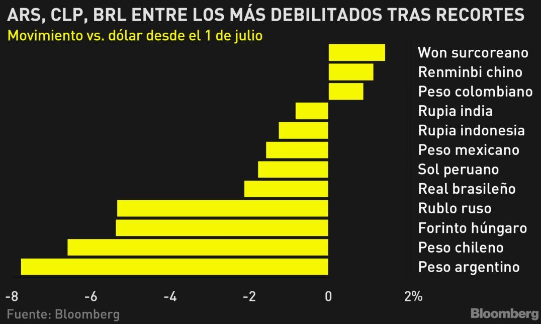 Si la Fed sigue elevando las tasas y los mercados emergentes flexibilizan su política monetaria, existe el riesgo de que sus divisas se debiliten. Las monedas de Colombia, México y Brasil registraron avances de dos dígitos frente al dólar en el primer semestre, mientras que las de Argentina y Chile son las que más han caído desde principios de julio.