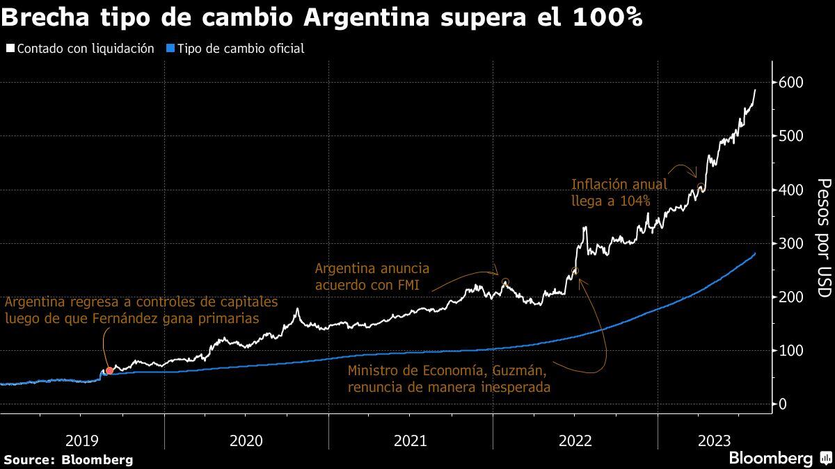 El tipo de cambio paralelo, conocido localmente como contado con liquidación, se debilitó hasta un 1.7% a alrededor de 591 pesos por dólar el lunes. El tipo de cambio oficial argentino cayó hasta un 1.4%, el mayor porcentaje intradía desde setiembre de 2020, lo que eleva la brecha entre los dos tipos a más del 109%.