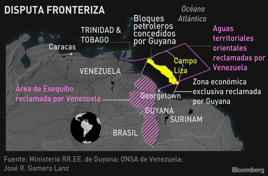 La semana pasada, Maduro ordenó a ExxonMobil Corp. y a otras empresas retirarse de la zona en un plazo de tres meses, dejando a Brasil y a otros países latinoamericanos en estado de alerta ante la posibilidad de un conflicto armado en la región. Exxon lidera una empresa conjunta que incluye a Hess Corp. en el bloque Stabroek de Guyana, que alberga el mayor descubrimiento mundial de crudo de la última década.