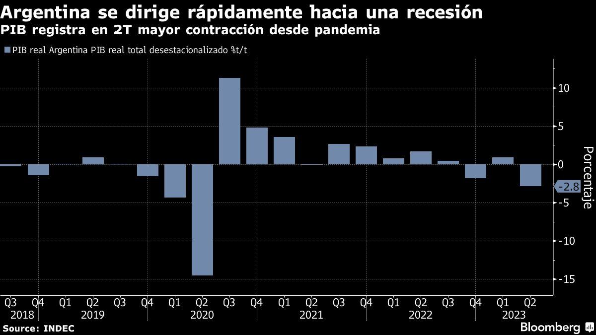 Se prevé que la economía argentina entre técnicamente en recesión (la sexta en una década) durante el tercer trimestre, ya que la inflación supera el 124%, impulsada por fallas de la política económica y la incertidumbre en torno a las elecciones presidenciales del 22 de octubre.