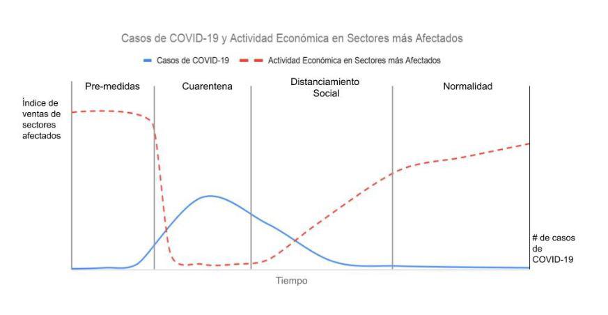 En la etapa de cuarentena la actividad económica de los sectores más afectados se reduce a cero o casi cero. Una vez terminada la cuarentena se siguen implementando medidas de distanciamiento social para reducir la probabilidad de una segunda ola; por lo que la actividad de los sectores más sensibles se recupera muy lentamente. Finalmente, cuando la cantidad de casos nuevos se estabiliza en un nivel muy bajo y la población ya está desarrollando inmunidad, la actividad de los sectores más afectados se estabiliza pero en un nivel inferior al pre-cuarentena, pues los hogares y empresas se siguen recuperando de un shock que ha afectado su capacidad de consumo. Este es solo un escenario, pero existe consenso entre los epidemiólogos de que es posible que surja una segunda ola y que se requiera volver a implementar medidas de cuarentena. También es incierto cuánto duraría la etapa de distanciamiento social.