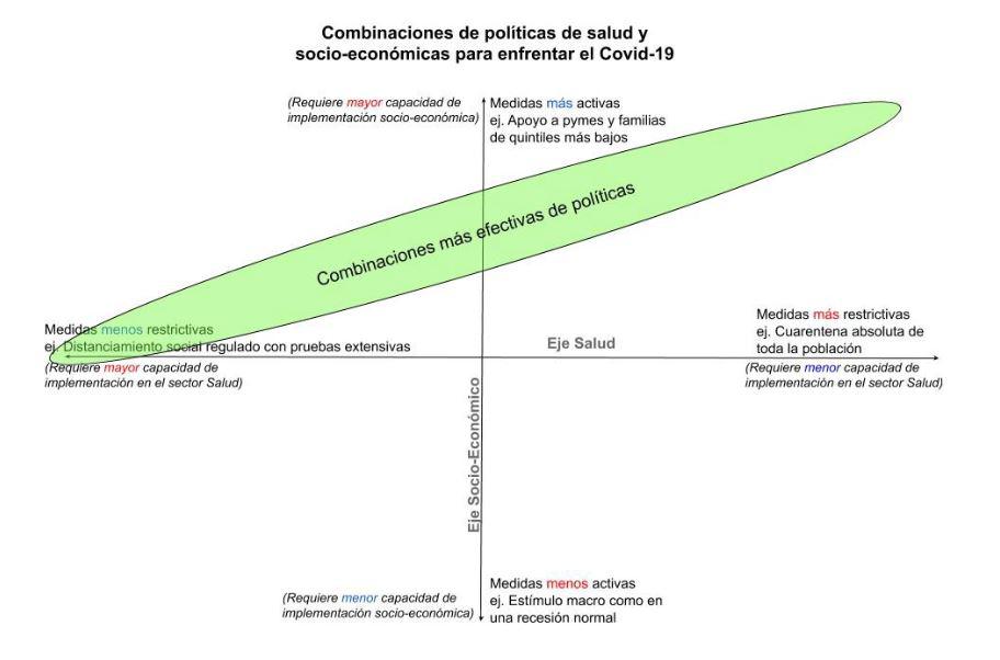Existe por lo tanto un espectro de combinaciones de políticas de salud y políticas socio-económicas para atender la crisis sanitaria minimizando el impacto humano total. A manera de referencia, ese espectro se señala con la zona sombreada. Donde se ubique un país en este espectro depende de su capacidad para implementar estas políticas en ambas dimensiones. Un país que no tiene la capacidad de Singapur o Corea del Sur para desplegar pruebas de manera masiva y para identificar y aislar velozmente posibles focos de contagio, quizá no tiene otra opción que ir por opciones más restrictivas, y por lo tanto tendrá que acompañarlas con políticas socio-económicas más activas.