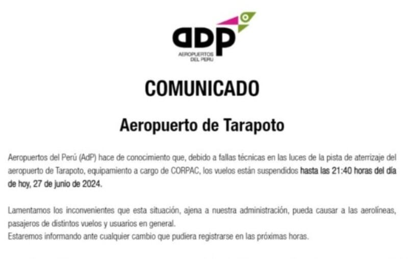 “Aeropuertos de Perú (ADP) hace de conocimiento que debido a fallas técnicas en las luces de la pista de aterrizaje del Aeropuerto de Tarapoto, equipamiento a cargo de Corpac, los vuelos están suspendidos hasta las 21:40 horas del día de hoy 27 de junio de 2024″, informó ADP, a través de un comunicado.