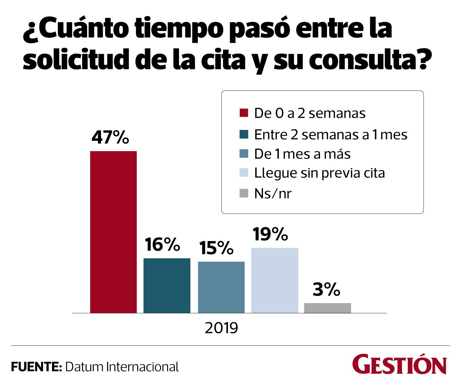 En cuanto al tiempo de espera al llegar a su cita, el 26% de personas que se atienden en establecimientos privados señaló que son atendidos a tiempo, mientras que esto sucede solo al 9% de quienes se atienden en establecimientos públicos.