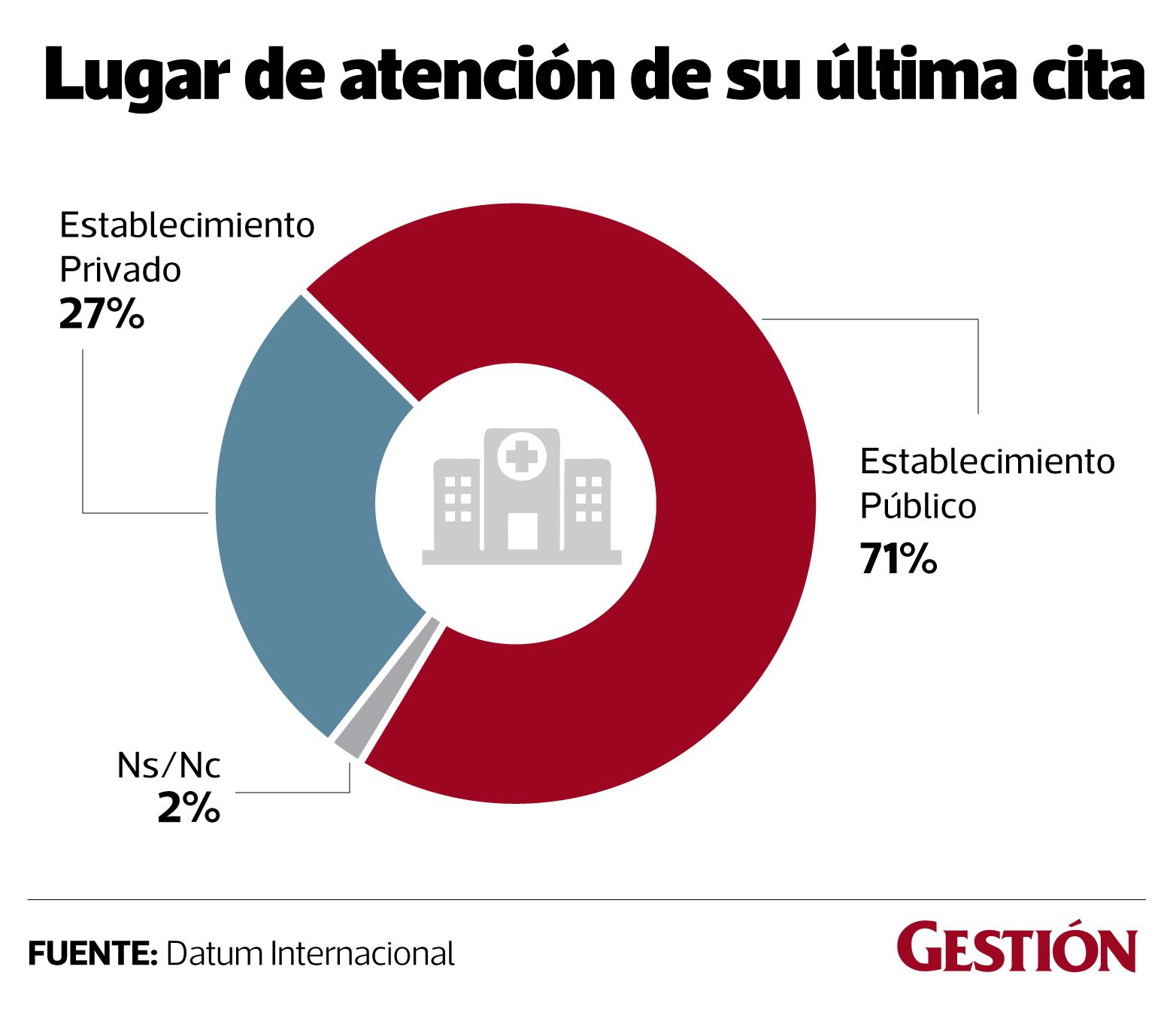 La mayor parte de la población (71%) declaró haber sido atendida en un establecimiento público de salud, en su última visita médica. El 54% de personas del NSE A/B indicaron que han acudido a un establecimiento privado.