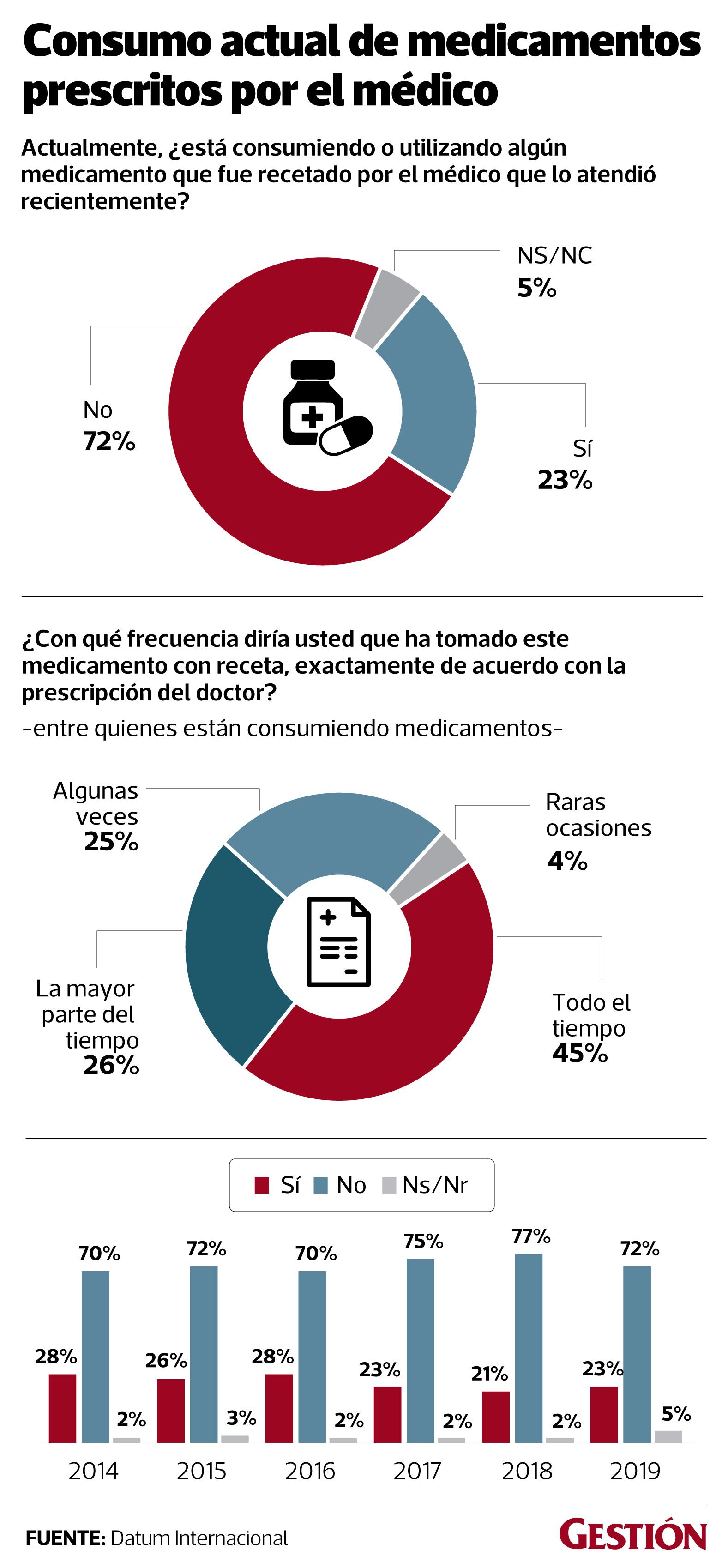 Según cifras de Datum, el 72% no está consumiendo un medicamento que fue recetado por el médico que lo atendió recientemente. “Esto revela que muchos peruanos se automedican cuando se presenta un malestar o están optando por un método alternativo para tratar la dolencia”, anotó Yrala.