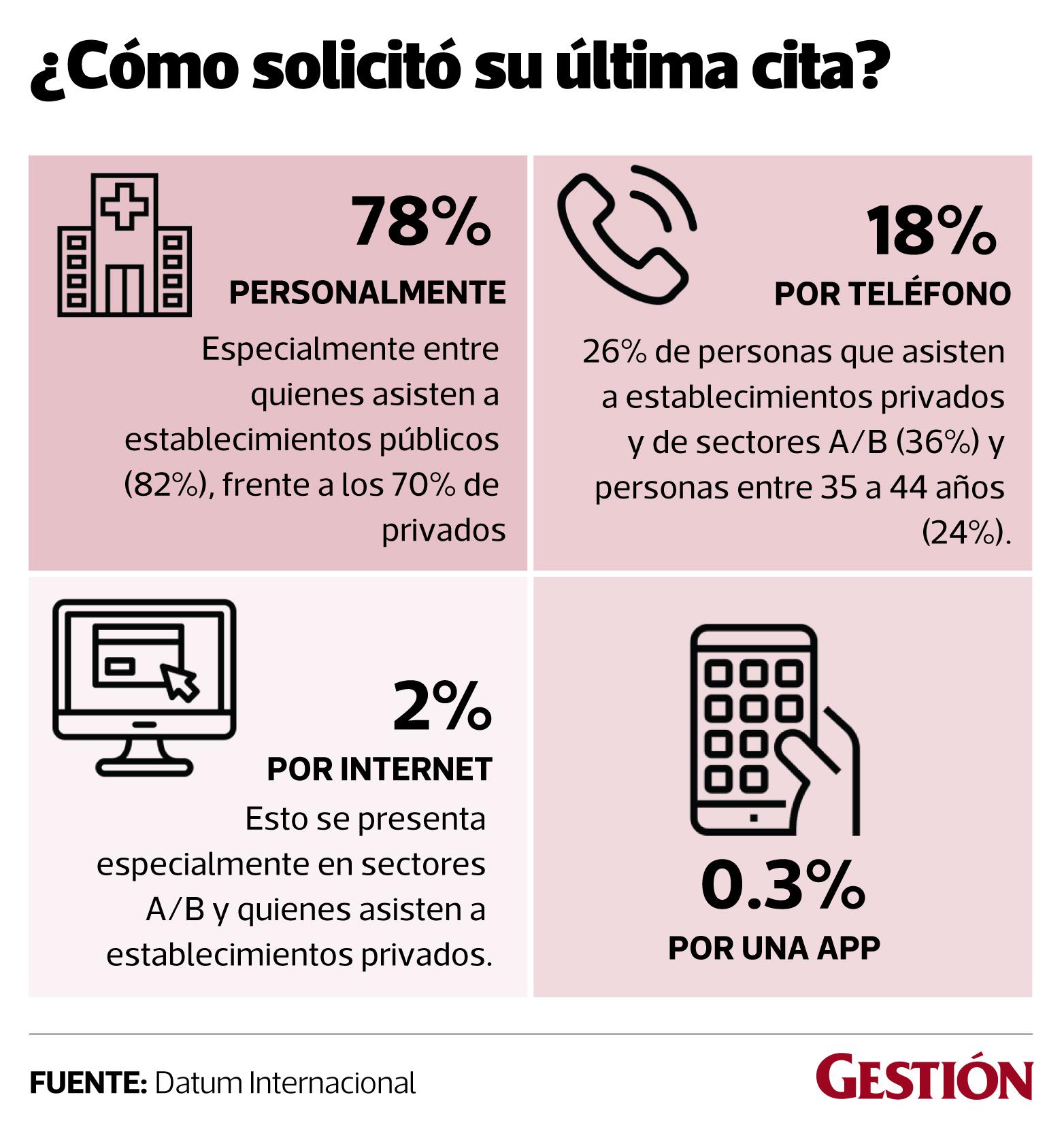 Para solicitar cita, los peruanos siguen preferiendo la atención personalizada y el 78% sacó su cita de manera presencial, solo el 0.3% utilizó una app.