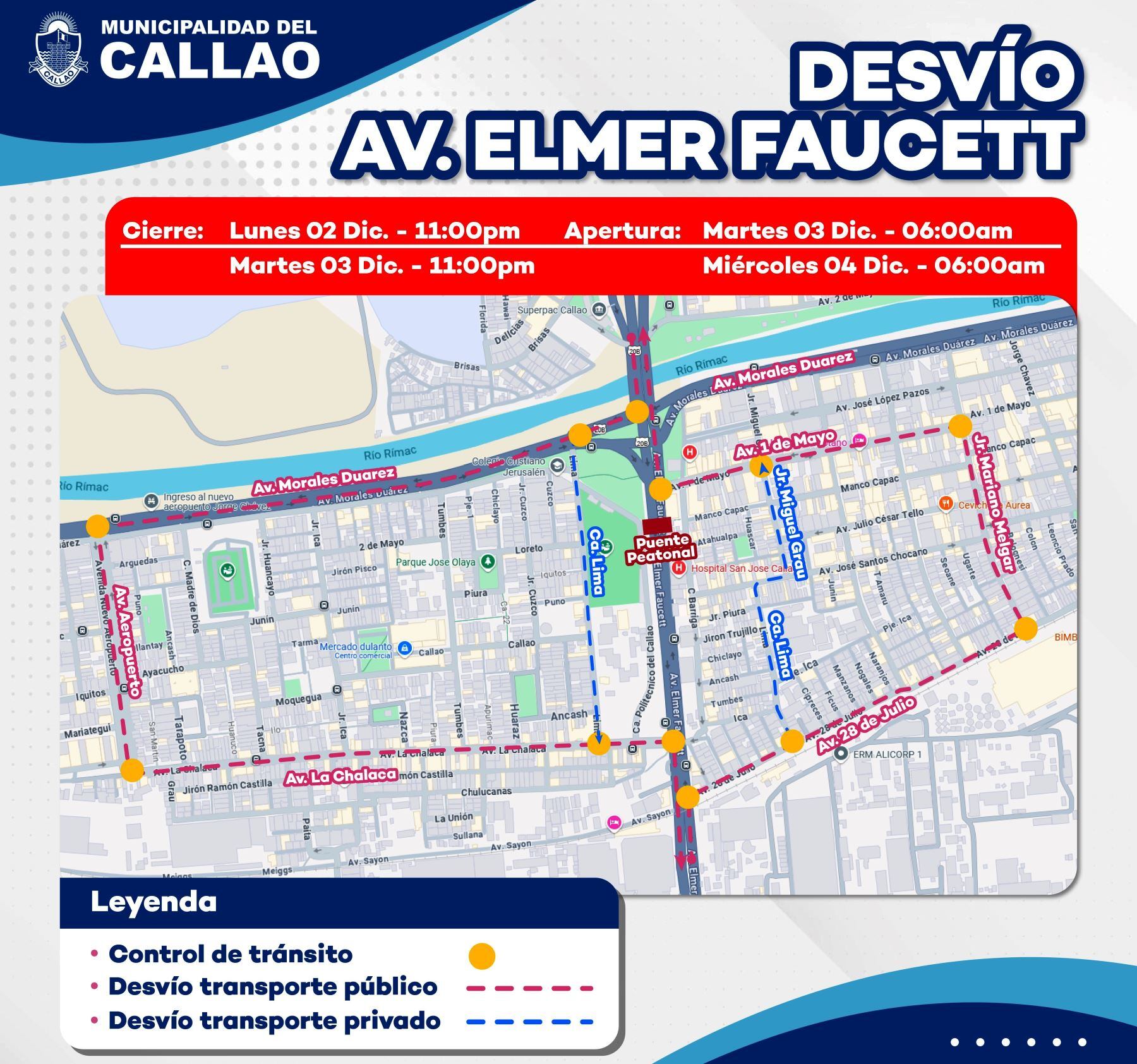 Ante estos cierres, la Municipalidad del Callao, con apoyo de la Policía Nacional, ejecutará un plan de desvío. Los vehículos que vengan por av. Faucett desde el aeropuerto, podrán ingresar por la av. Morales Duárez para luego entrar a la av. Nuevo Aeropuerto y la av. la Chalaca, para luego regresar a la av. Faucett.