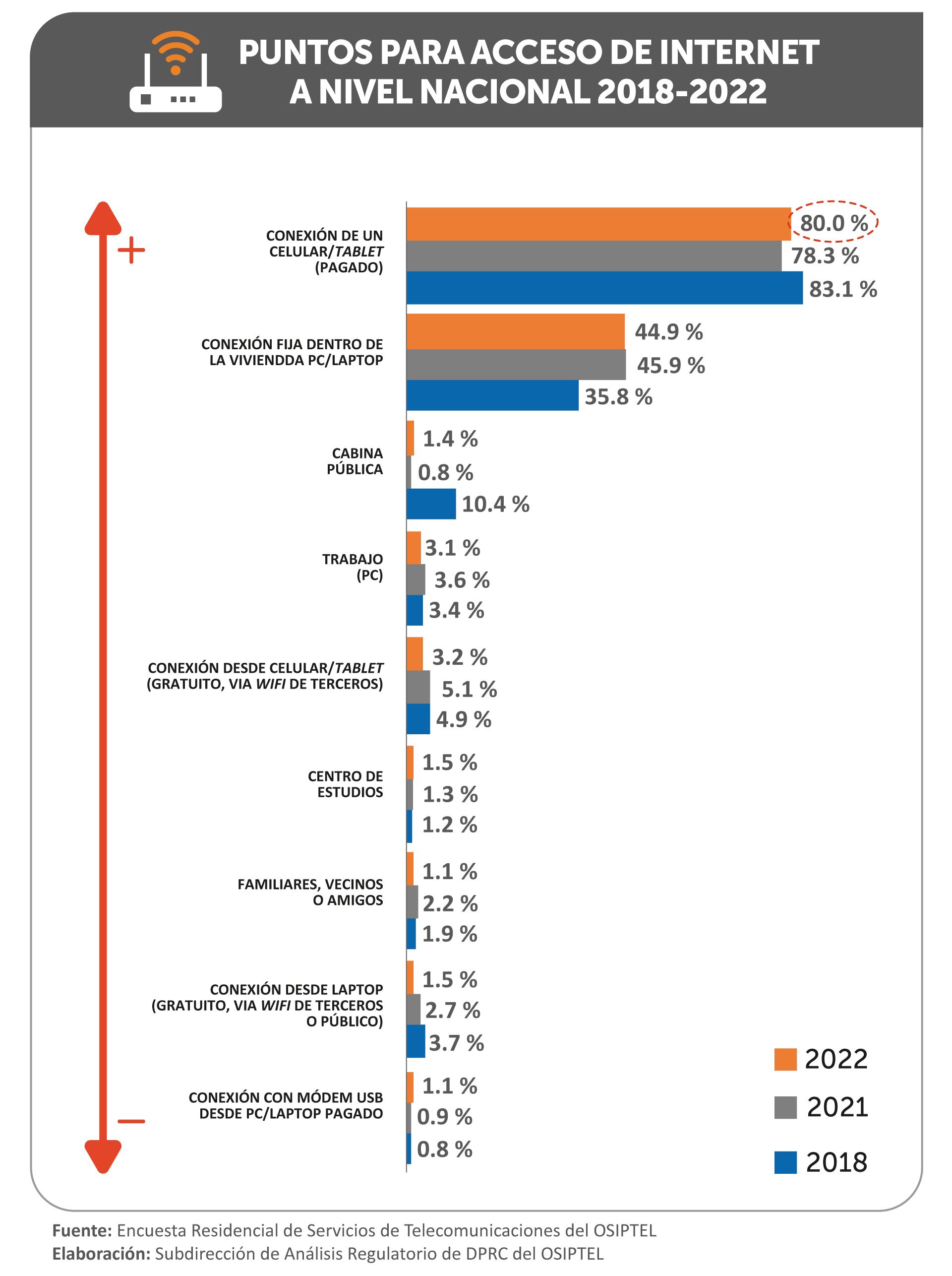 Con respecto a los puntos de acceso, los resultados de la Erestel 2022 mostraron un repunte a nivel nacional del uso de internet desde una conexión móvil de pago (celular o tablet), pasando del 78.3 % en 2021 a 80.0 % en 2022. Este crecimiento de 1.7 puntos porcentuales consolida esta modalidad como el punto de acceso más utilizado por los peruanos.