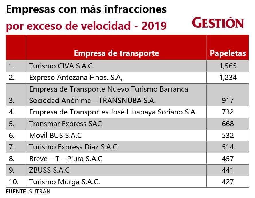 Durante el 2019 la Superintendencia de Transporte Terrestre de Personas, Carga y Mercancías (Sutran) detectó un total de 24,357 infracciones por exceso de velocidad en carreteras a empresas de transporte de ámbito nacional.