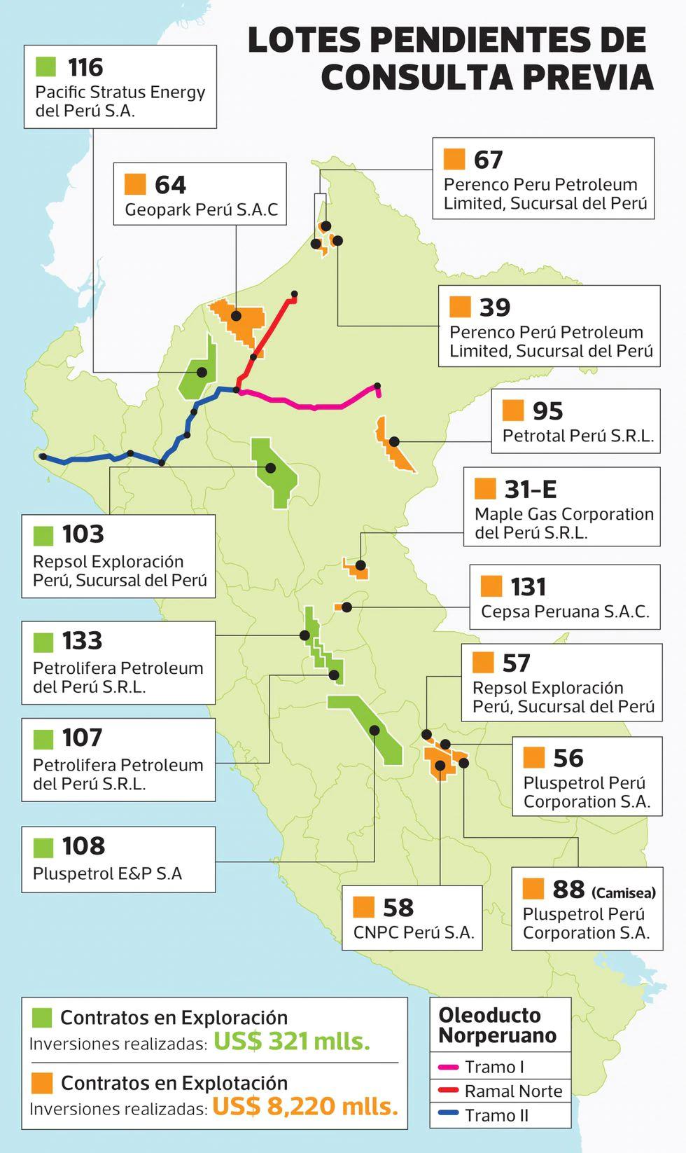 Según información de Perupetro, son 5 contratos que se encuentran en fase de exploración y que acumulan inversiones por US$ 321 millones, y otros 10 contratos con inversiones realizadas de US$ 8,220 millones en fase de explotación. En total US$ 8,541 millones de inversión en hidrocarburos que están en juego.