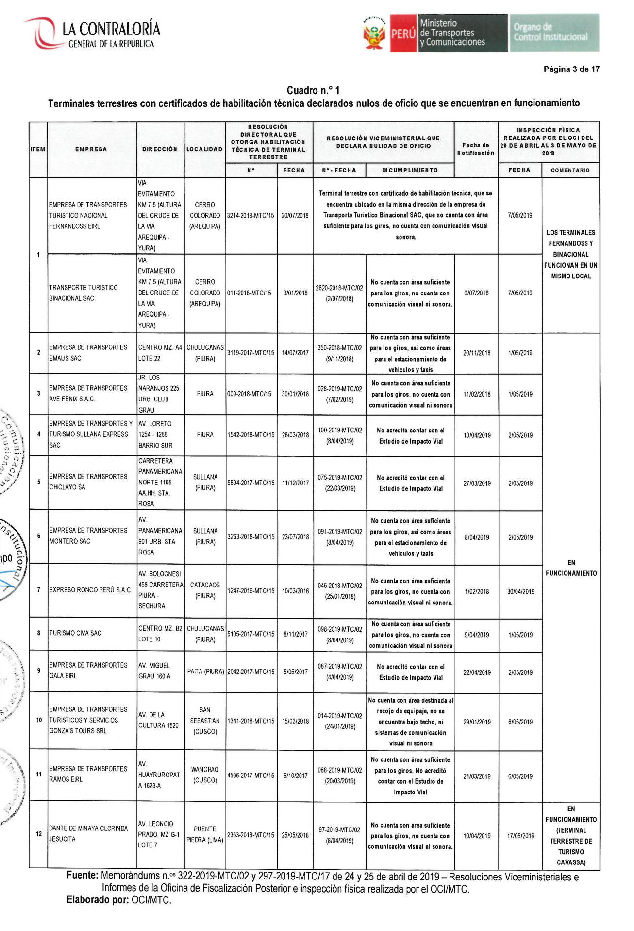 Según el informe de orientación de oficio 082-2019-OCI, la Contraloría inspeccionó 12 terminales terrestres cuyas habilitaciones técnicas fueron declaradas nulas por el Ministerio de Transportes y Comunicaciones entre el 2018 y 2019.