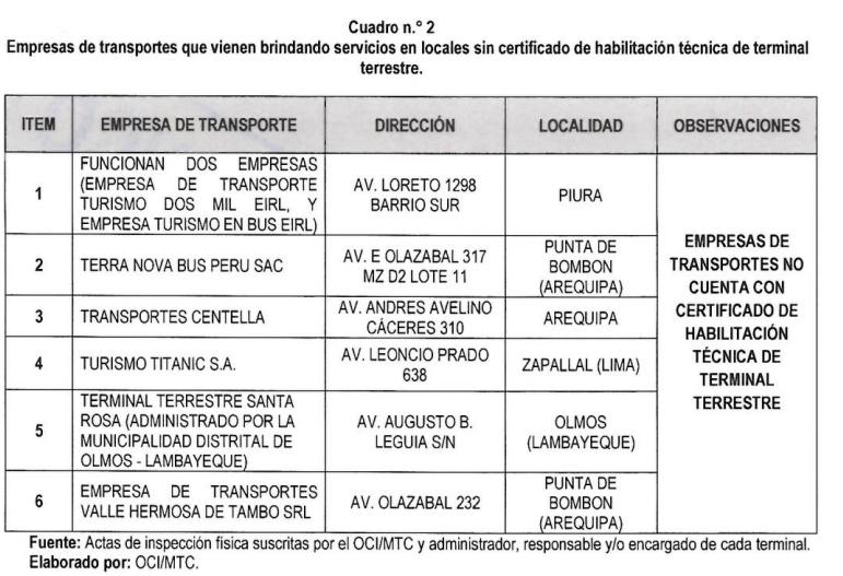 También se encontraron otros seis terminales terrestres los cuales operan sin tener la habilitación técnica necesaria del Ministerio de Transportes y Comunicaciones (MTC) para ser consideradas un terminal terrestre. Tres terminales están ubicados en Arequipa, uno en Piura, uno en Lambayeque y uno en Lima.
