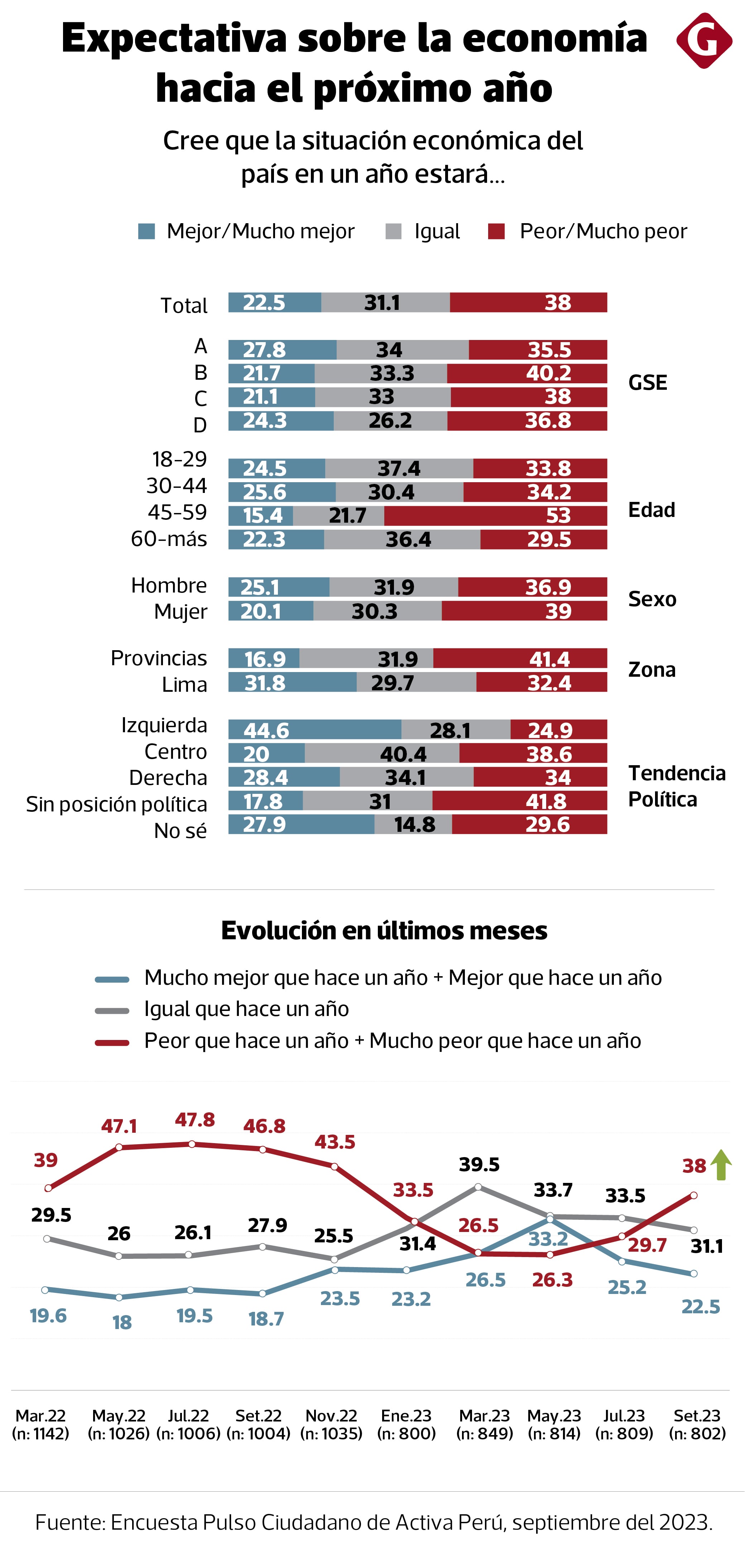 No obstante, este indicador aún se encuentra por debajo del 47% registrado el año pasado, en el anterior Gobierno de Pedro Castillo (ver cuadro). Asimismo, en la encuesta de septiembre las respuestas pesimistas sobre el futuro de la economía superaron a las optimistas en todos los niveles socioeconómicos.