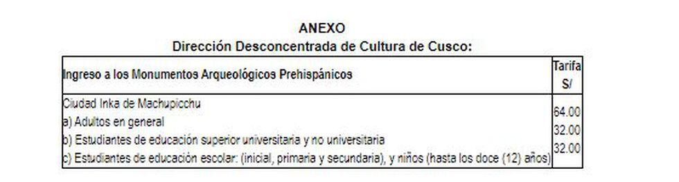 Según la Resolución del Ministerio de Cultura N°505-2019-MC, publicada en El Peruano, el ingreso para los adultos en general costará S/ 64, mientras que los estudiantes de educación superior universitaria y no universitaria pagarán S/ 32.