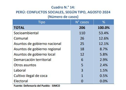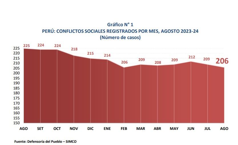 Existen 206 conflictos sociales (157 activos y 49 latentes), tres casos menos que el mes anterior, según se desprende del Reporte de Conflictos Sociales N° 246 de la Defensoría del Pueblo, correspondiente al mes de agosto de 2024.